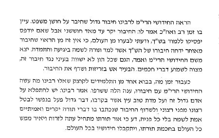 The Chidushai Harim showed the Kotzker Rebbe a manuscript on Torah he wrote on the Choshen Mishpat, (the portion of Jewish law that deals with civil law).  The Kotzker looked at it for a long time and afterwards said – This manuscript is very special, however, I am afraid that if you publish it, people will stop learning  the Shach (a major commentary printed along the side of the Choshen Mishpat text).  The Shach learned Torah for its own sake with major effort and diligence.  The Chedushai Harim left the Kotzker presence and said, even though my manuscript is invaluable, it is a commandment to listen to the words of Torah scholars.  The Chedushai Harim started a fire and burnt his manuscript.