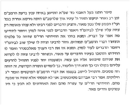 I told my Torah original thought to the Kotzker and he did not say anyting.  The Kotzker told me to return to the study hall and say the Torah thought to a scholar you meet in the study hall, and report back to me.  I  found the Chidushai Harim.  The Chidushai Harim  did not agree with my Torah and felt that the Rambam was still difficult.  I reported back to the Kotzker,  who again told me to return to the study hall to speak with another Torah scholar.  I found Reb Henoch M’Alexander, who greatly appreciated and agreed with my Torah.  I returned to the Kotzker who called in the Chedushai Harim and Reb Henoch M’Alexander.  The three  of us stood  before the Kotzker, who scolded us and said, is this the way you learn the holy Torah, with uncertainty,  This one says it is difficult and the other says it is  correct.  The Kotzker proceeded  to explain the Rambam and answered it 13 different ways.  The Avnei Nezer said, I only understood  6 or 7 of the answers, the Chidushai Harim understood up to 10, and the remaining answers  we did not understand  due to their depth and sharpness.